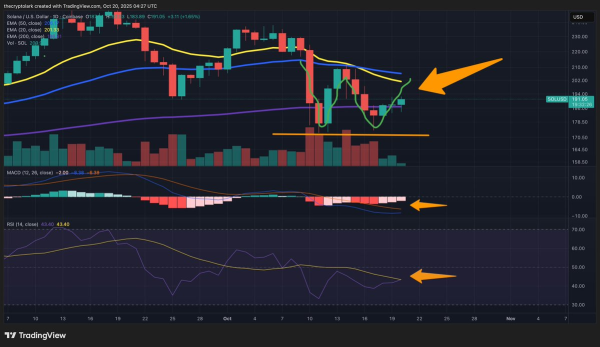 Solana was trading above $195 on October 21 after bouncing off the resistance at $174 on October 17. As the bullish sentiment surges, traders eye a breakout toward $250 in the coming weeks. The move formed a double bottom on the daily chart, hinting that the dip under $180 was a key entry point.