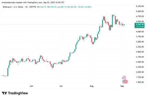 Ethereum (ETH) stands at a strong point of above $4,300, performing well following a great summer rally. The chart indicates an uptrend after the lows of June, around $2,900. ETH has been moving upwards to test the resistance around $4,956 and then falling back into the consolidation. Despite recent sideways trading, buyers are holding the 60-day moving average, which means sentiment remains bullish.