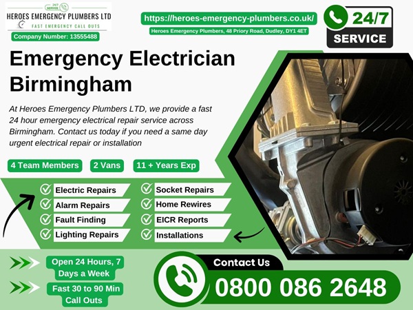 Emergency Electrician Birmingham – Call 0800 086 2648 – Heroes Emergency Plumbers 48 Priory Road Dudley DY1 4ET