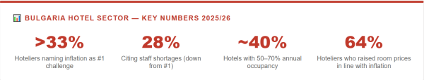 According to the annual Business Climate in the Hotel Industry 2025/26 survey, conducted in February by the Hotel Forum (HTIF) and the Bulgarian Association of Hotel Executives (BAHE), more than one third of hotel operators now identify inflation and the surging cost of goods and services as their primary business obstacle. Staff shortages, the perennial leader, slipped to second place at 28%. The Bulgarian news coverage of this shift has been wide, but the full picture is more nuanced than any single headline can capture.