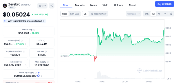 As of October 31, ZEREBRO was trading at $0.05041 following a 48.26% jump over the past week. Over the past 30 days, ZEREBRO has grown