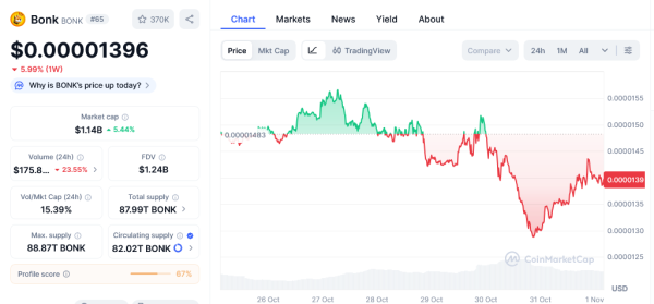 As of October 31, BONK’s value stands at $0.00001396 following a 5.99% drop over the past week. BONK’s 30-day price charts show a 31.68% fall.